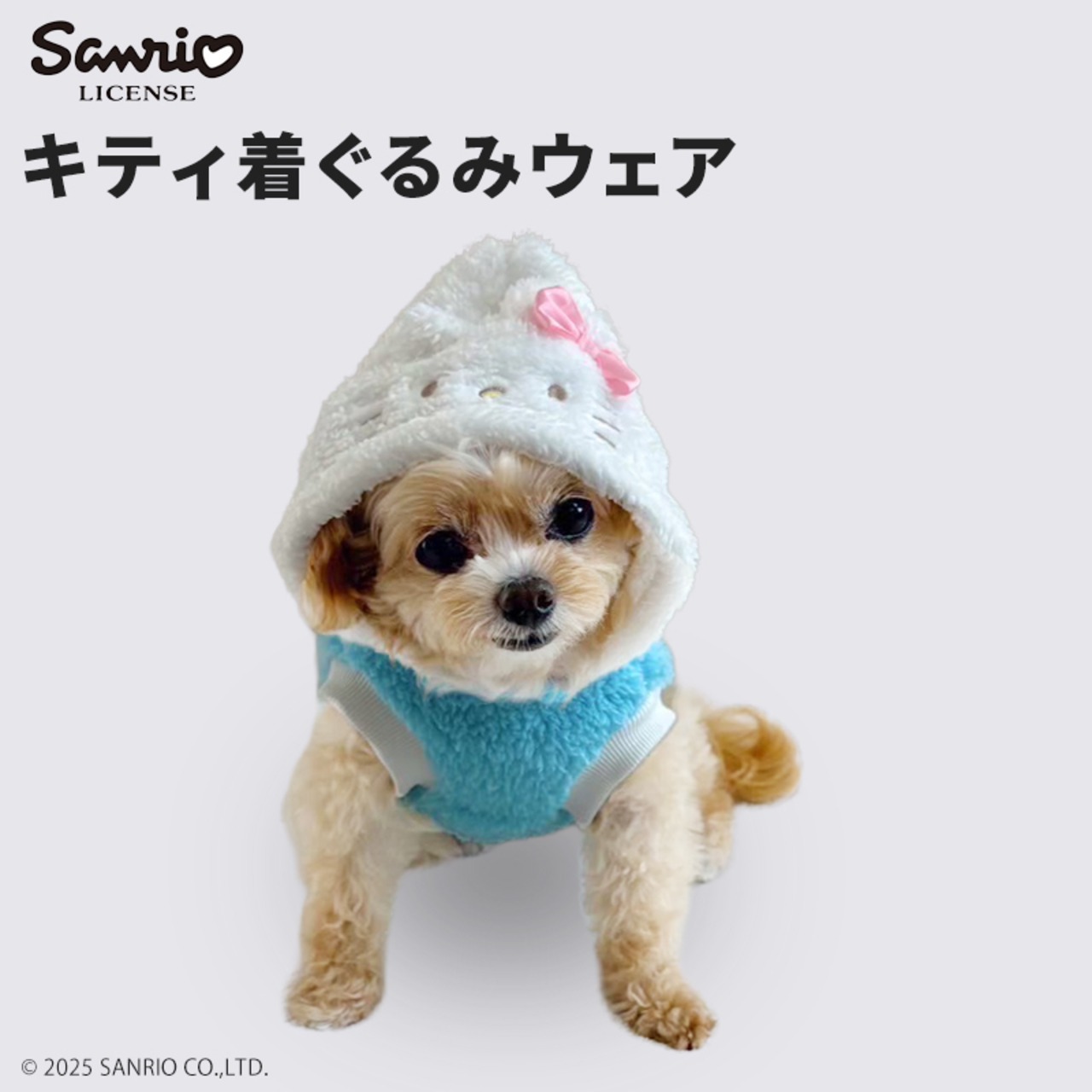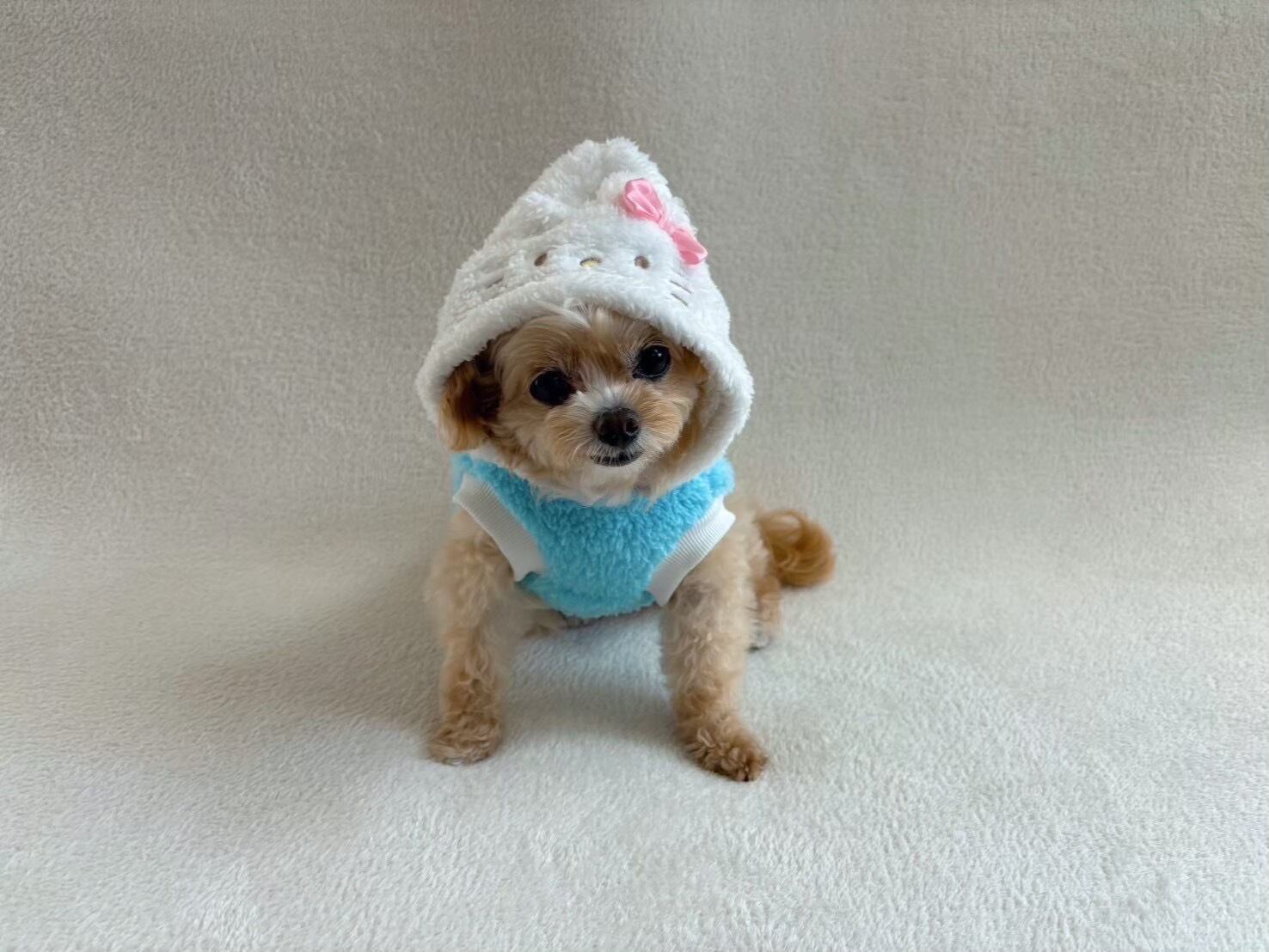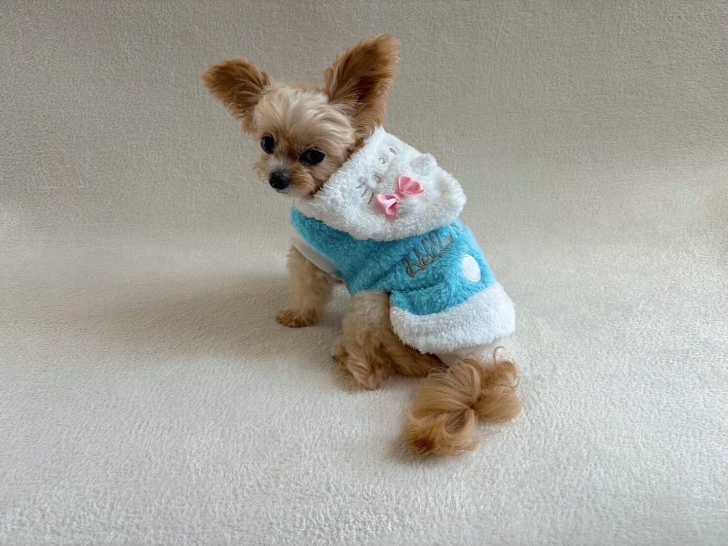 フードを被って 『キティ』に変身できるペットパーカー 秋冬に活躍するモフモフ仕様 フードにはお顔がついてて被った時が最高にかわいい!袖なしタイプで短犬種も対応。