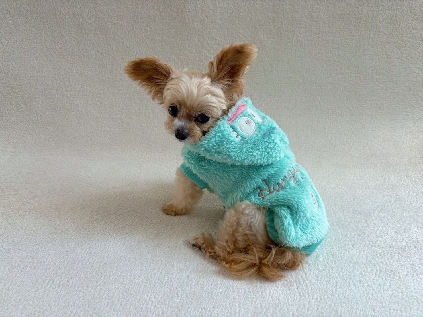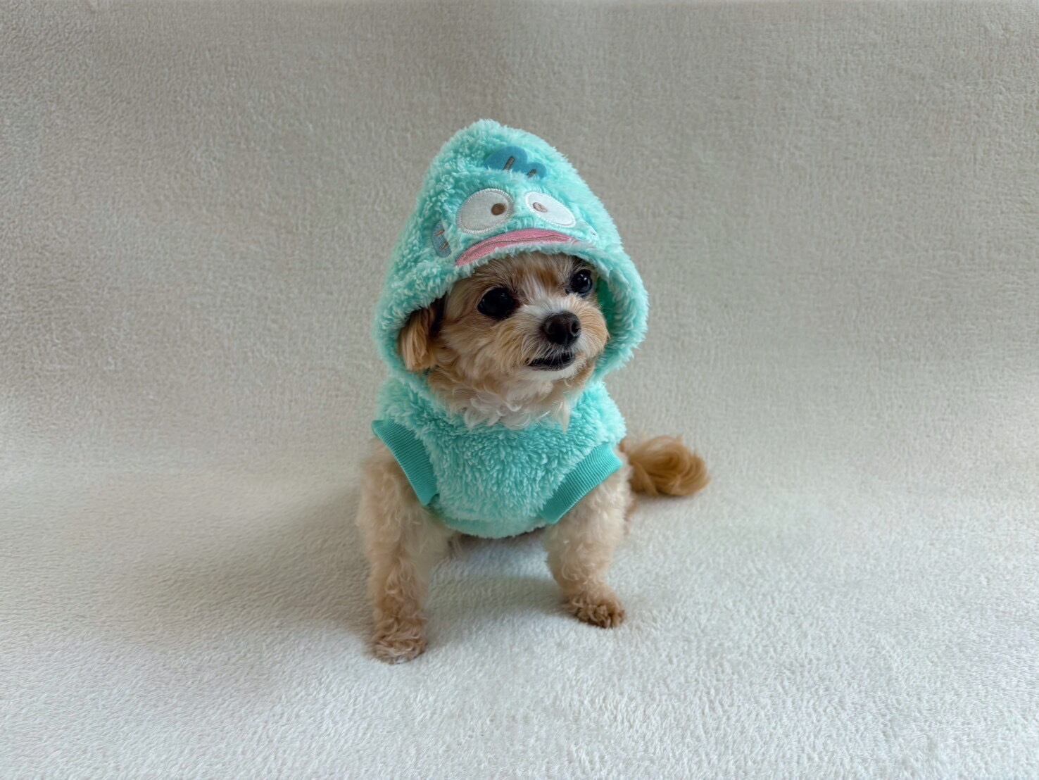 フードを被って 『ハンギョドン』に変身できるペットパーカー 秋冬に活躍するモフモフ仕様 。フードにはお顔がついてて被った時が最高にかわいい!袖なしタイプで短犬種も対応。