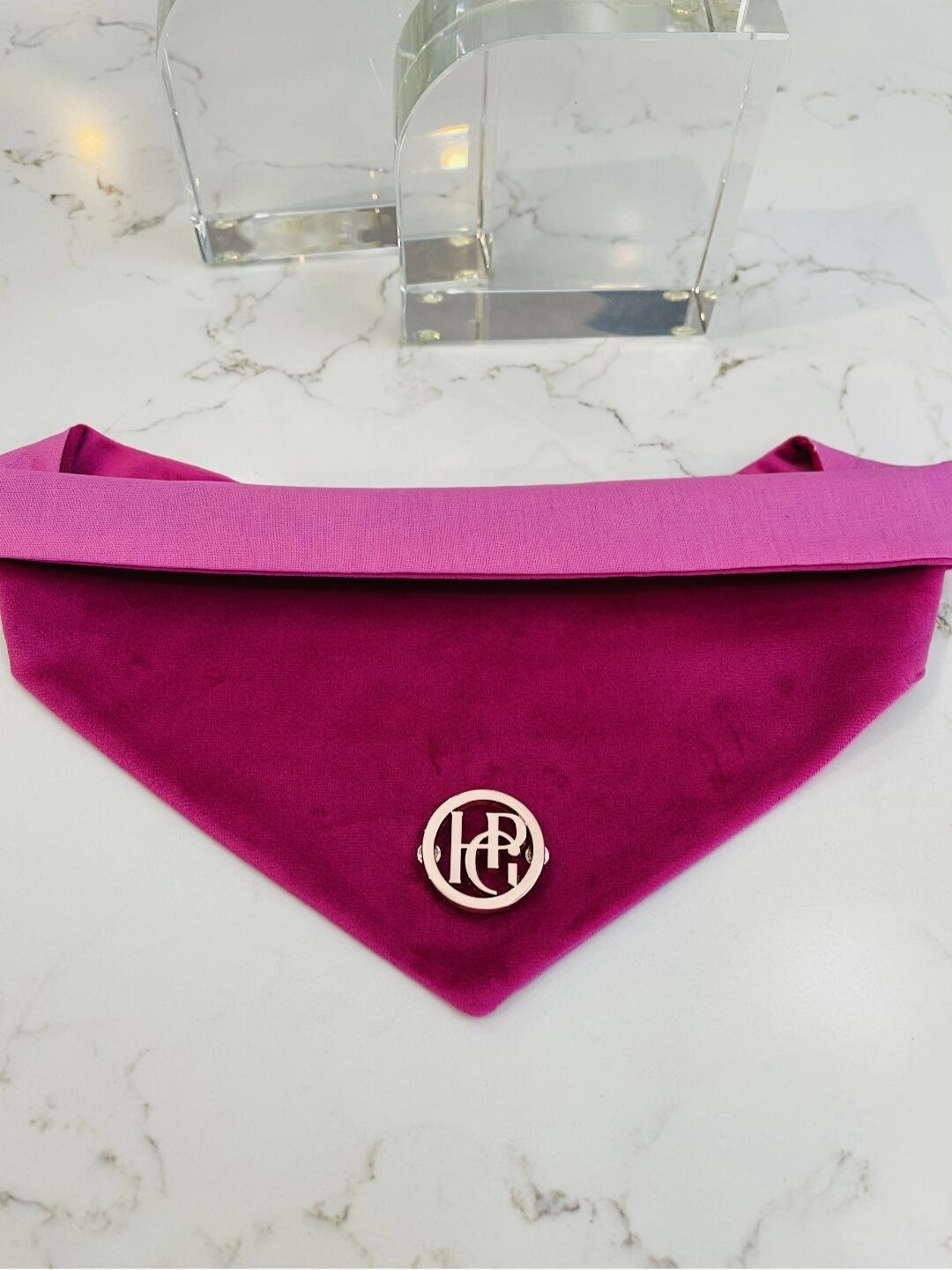 ベルベット素材にエンブレムがついたラグジュアリーな雰囲気のスカーフです。ファッションアイテムとして1つで、又はお洋服などと組み合わせても際立つアイテムです。