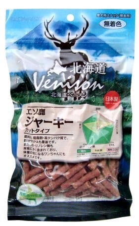 北海道のエゾ鹿肉を使用したジャーキーです。エゾ鹿肉は牛肉や鶏肉のアレルギーに悩んでいるわんちゃんにおすすめです。またEPAやα-リノレン酸も豊富で、カロリーやコレステロールが気になるわんちゃんにもおすすめです