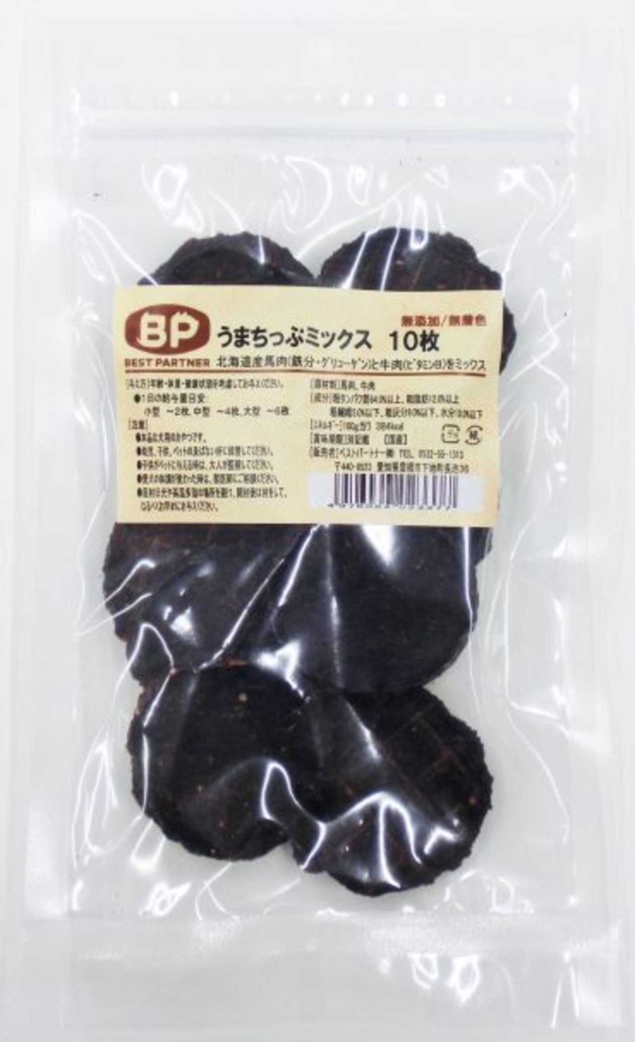 カルシウム・鉄分・グリコーゲン(馬肉)、ビタミンB群(牛肉)の補給に。北海道産の馬肉と牛肉をミックスしぎゅっと凝縮、チップスに仕上げました。