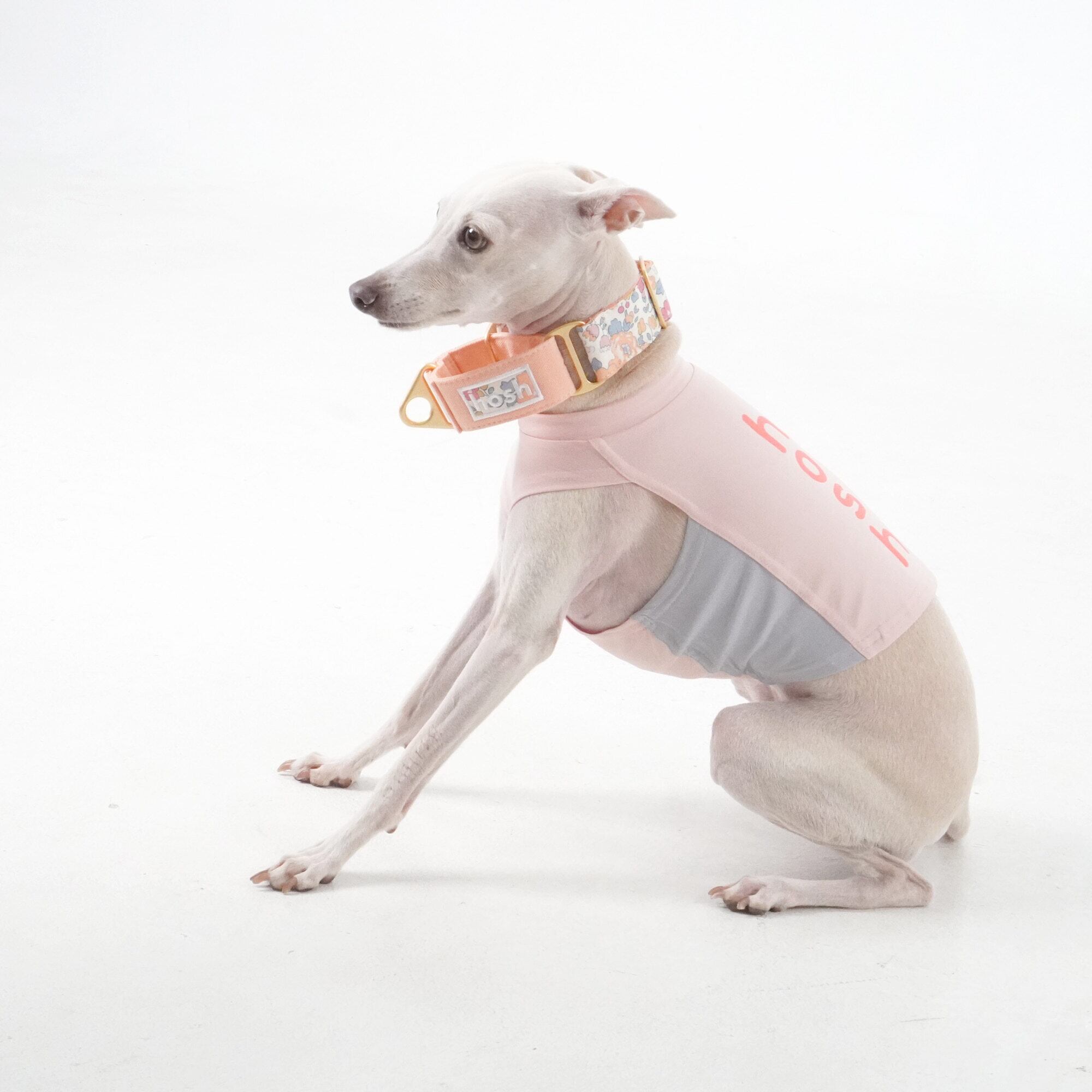 リバティ生地にホッシュボックスロゴを入れたネックライン。イタリアングレイハウンドだけでなく、他犬種でも安全で快適に使用できます。リバティーロンドンの3カラーの生地と各カラーに合った綿生地を使用して、引っ張る衝撃を緩和させてくれます。