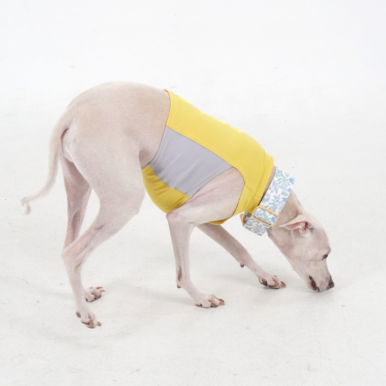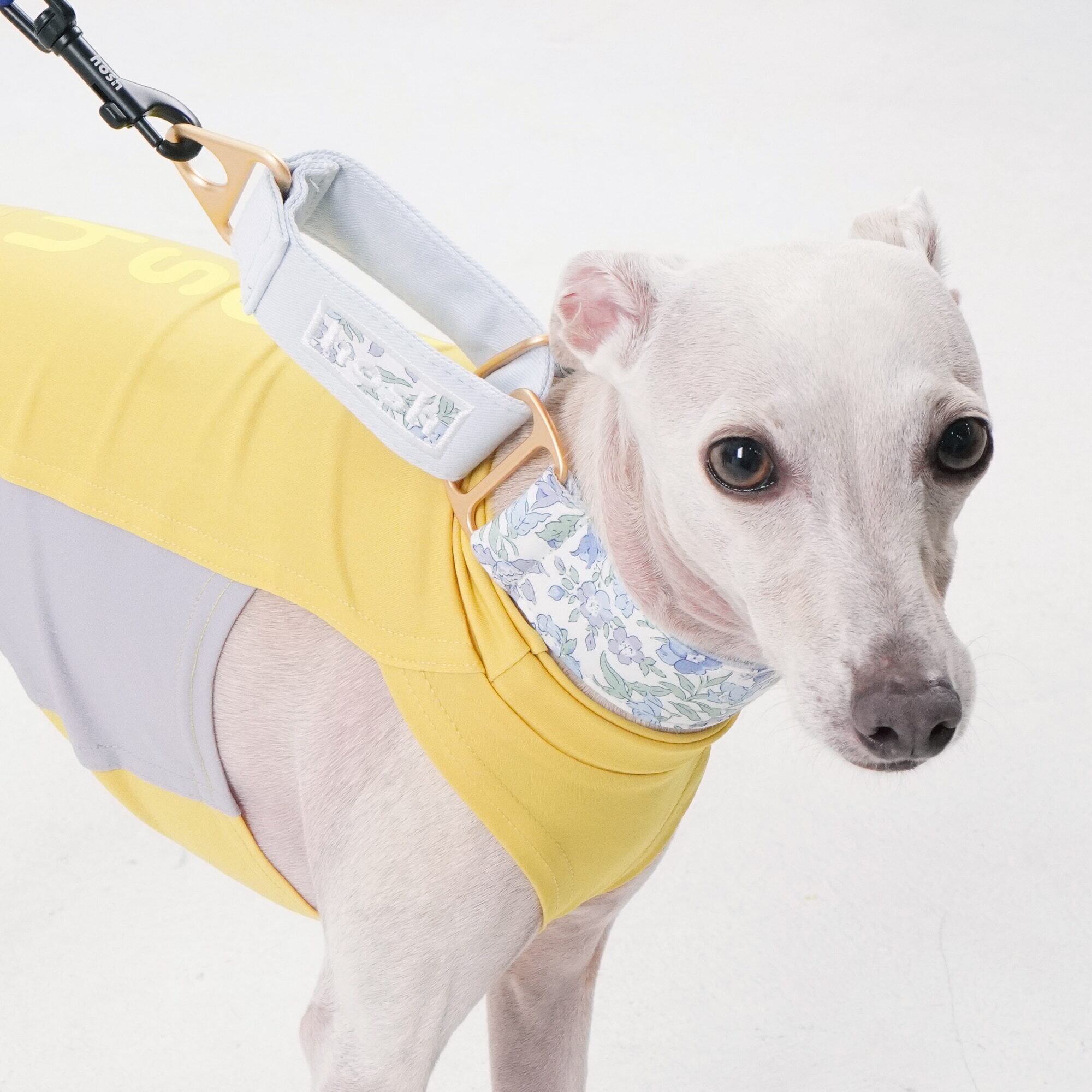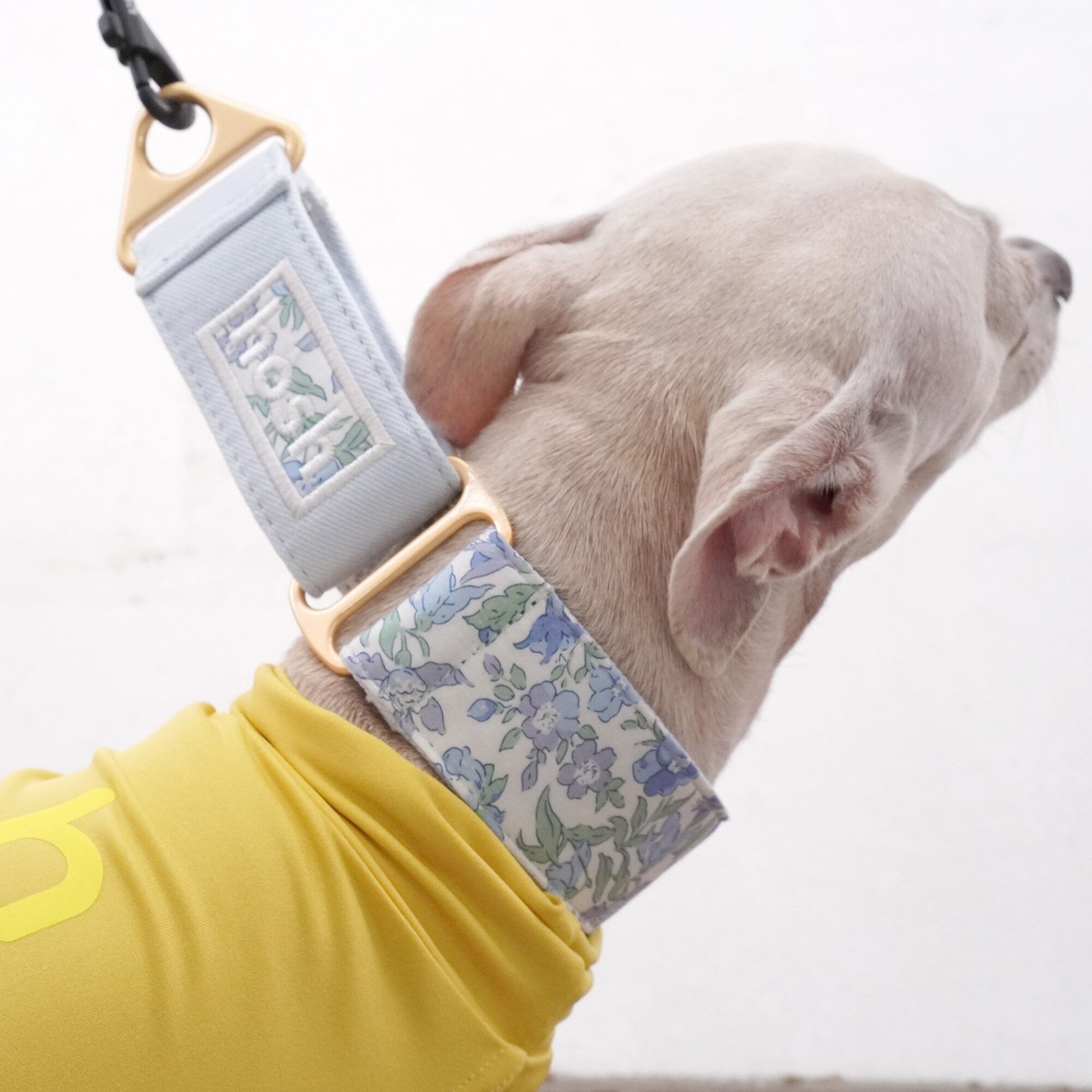 リバティ生地にホッシュボックスロゴを入れたネックライン。イタリアングレイハウンドだけでなく、他犬種でも安全で快適に使用できます。リバティーロンドンの3カラーの生地と各カラーに合った綿生地を使用して、引っ張る衝撃を緩和させてくれます。
