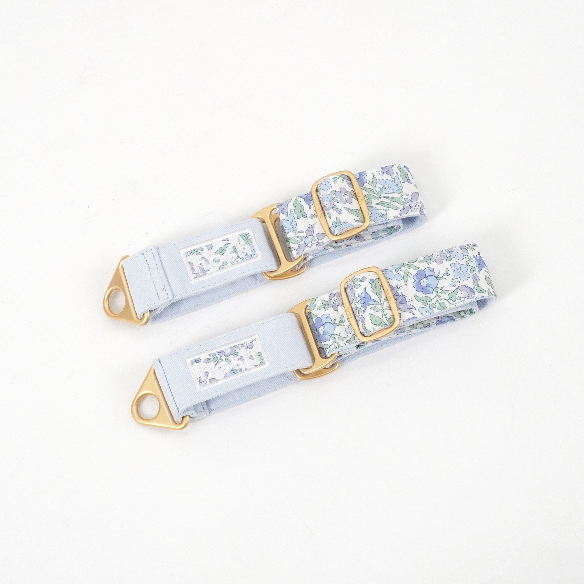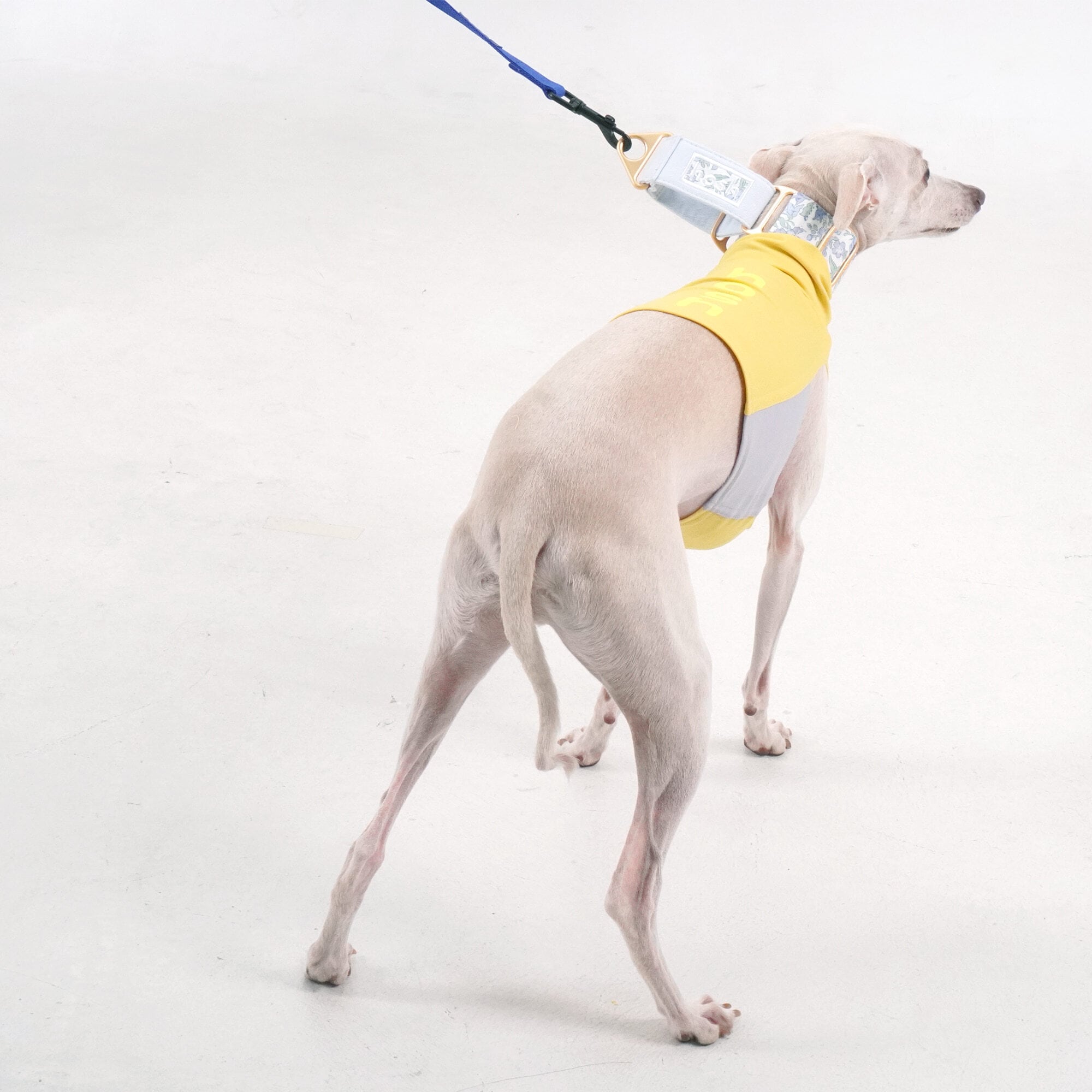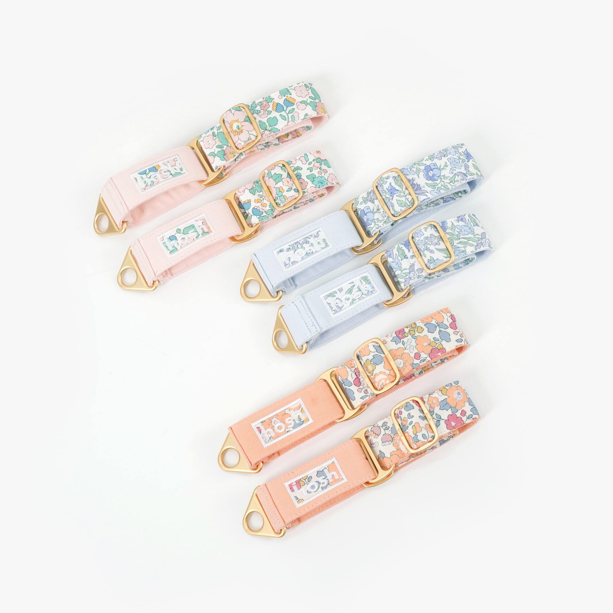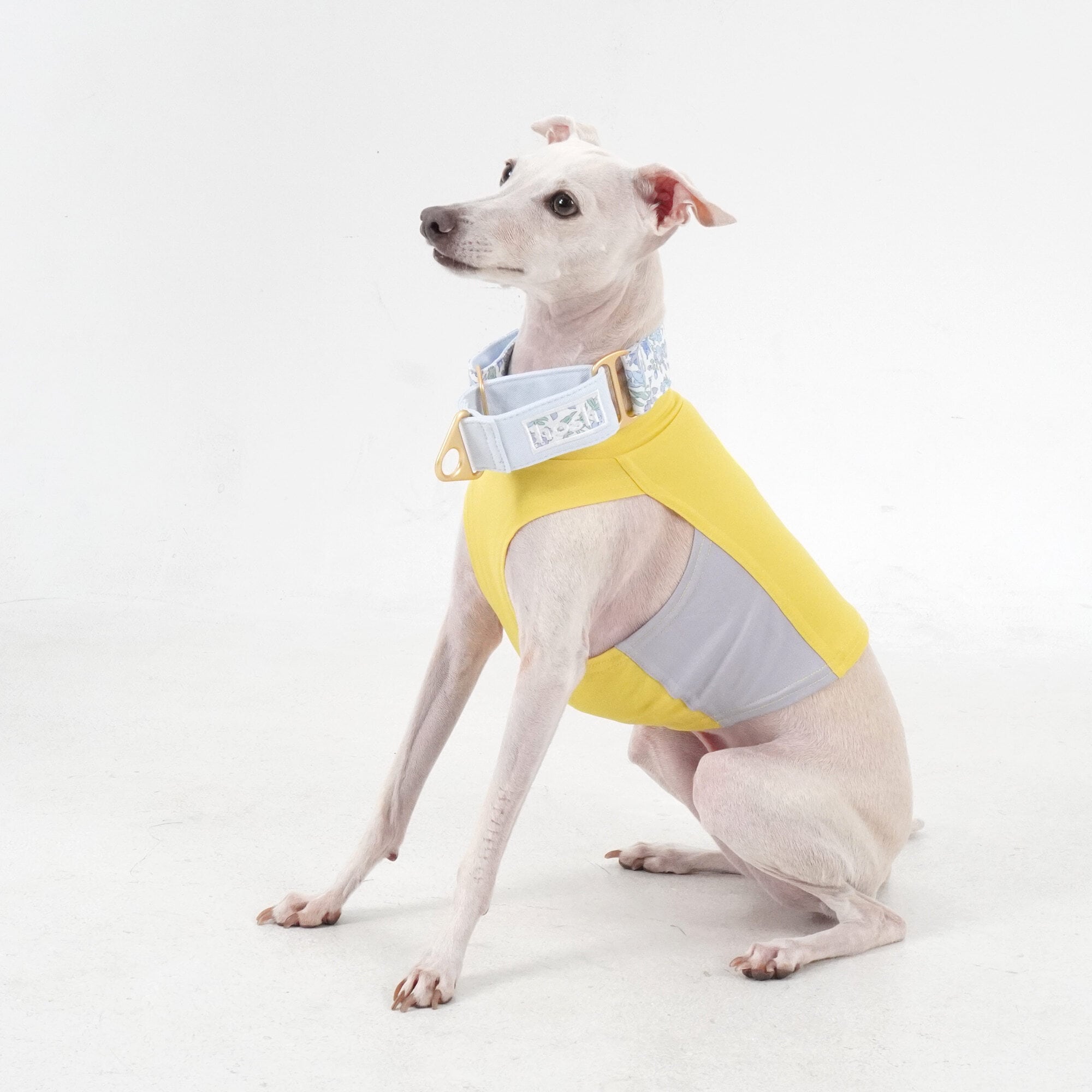 リバティ生地にホッシュボックスロゴを入れたネックライン。イタリアングレイハウンドだけでなく、他犬種でも安全で快適に使用できます。リバティーロンドンの3カラーの生地と各カラーに合った綿生地を使用して、引っ張る衝撃を緩和させてくれます。
