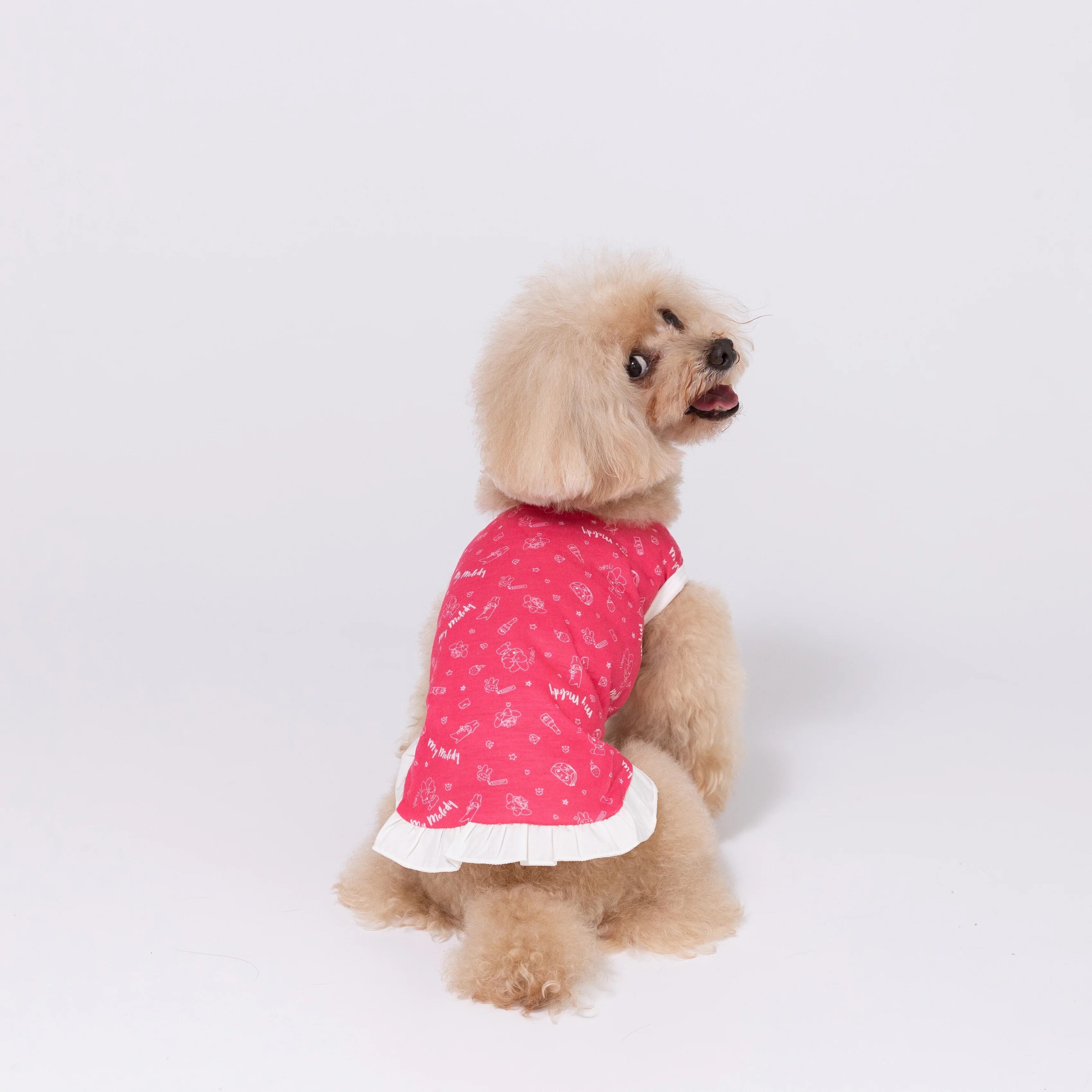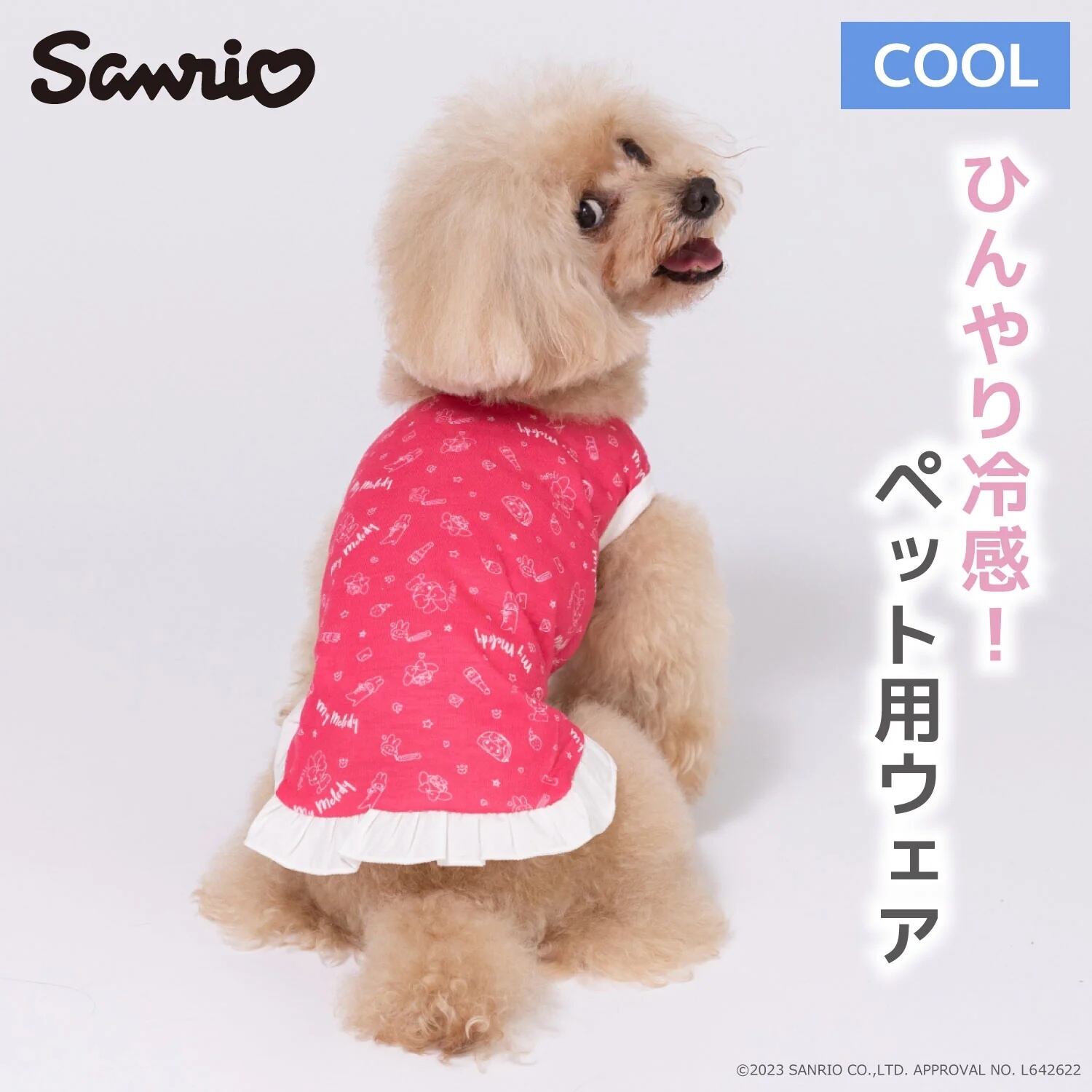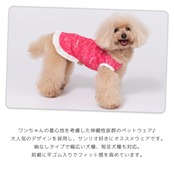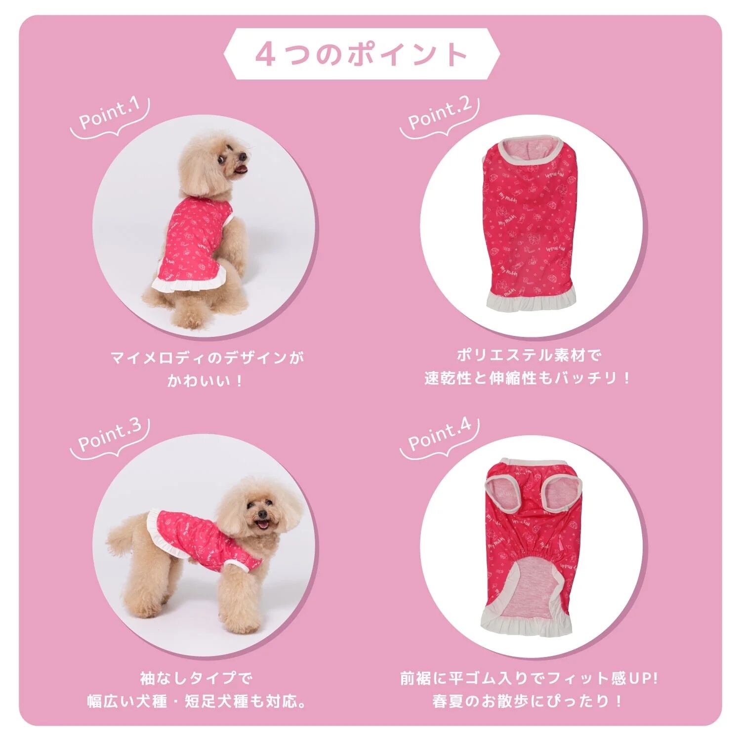 Tシャツタイプの袖なしタイプで幅広い犬種・短足犬種も対応。ポリエステル素材を採用し速乾性と伸縮性、前裾に平ゴム入りでフィット感を高めています。マイメロディはうさぎモチーフのすなおで明るい、弟思いの女のコ。