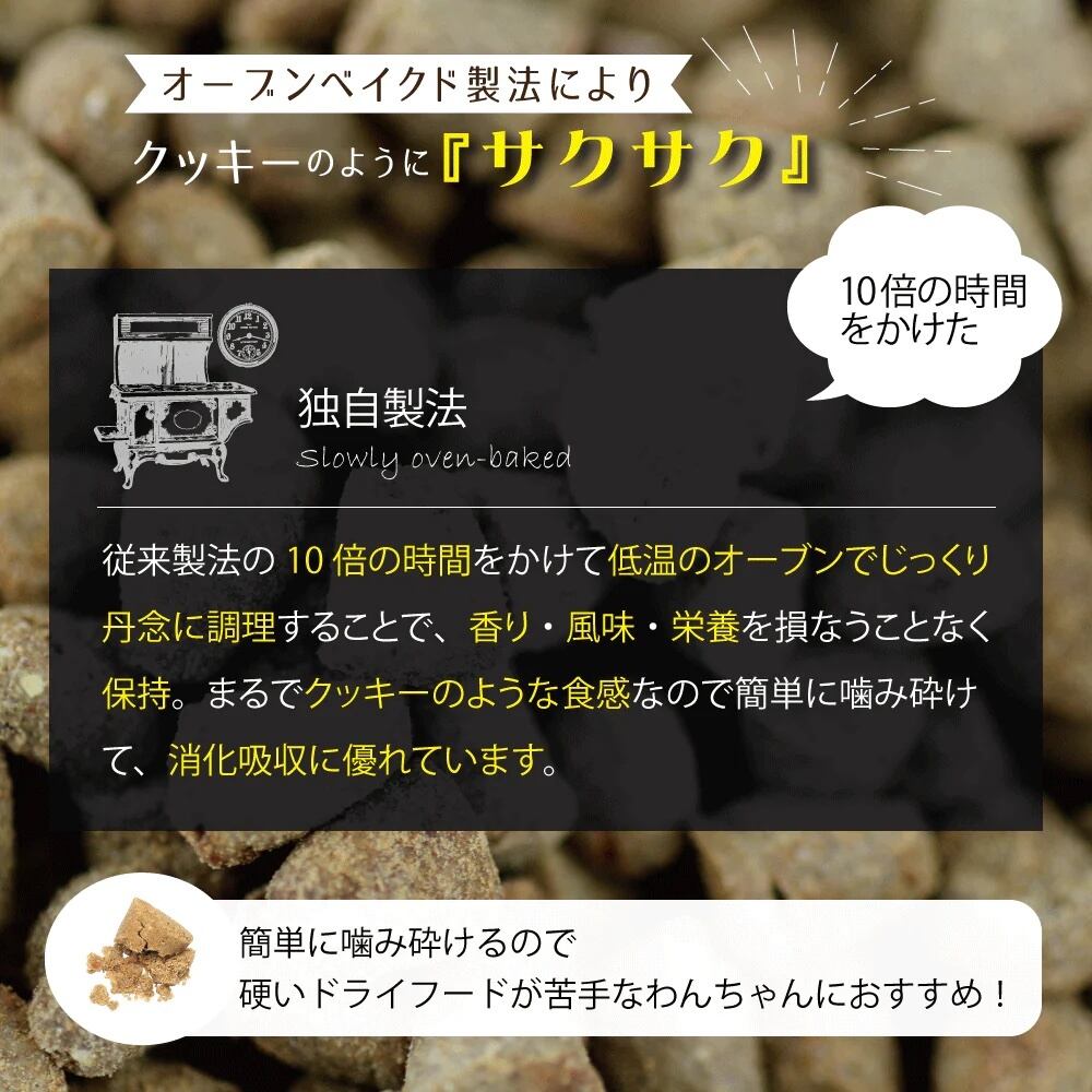 「オーブンベークド製法」は粒がカチカチに硬くなることがなく、 簡単に噛み砕けて、消化吸収に優れています。