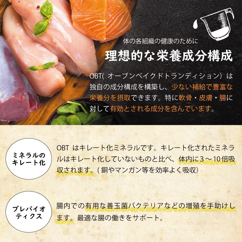 オーブンベークドトラディション(※以下 OBT)は従来のドライフードの製造にかかる時間の、実に10倍の時間をかけて丹念に調理されています。