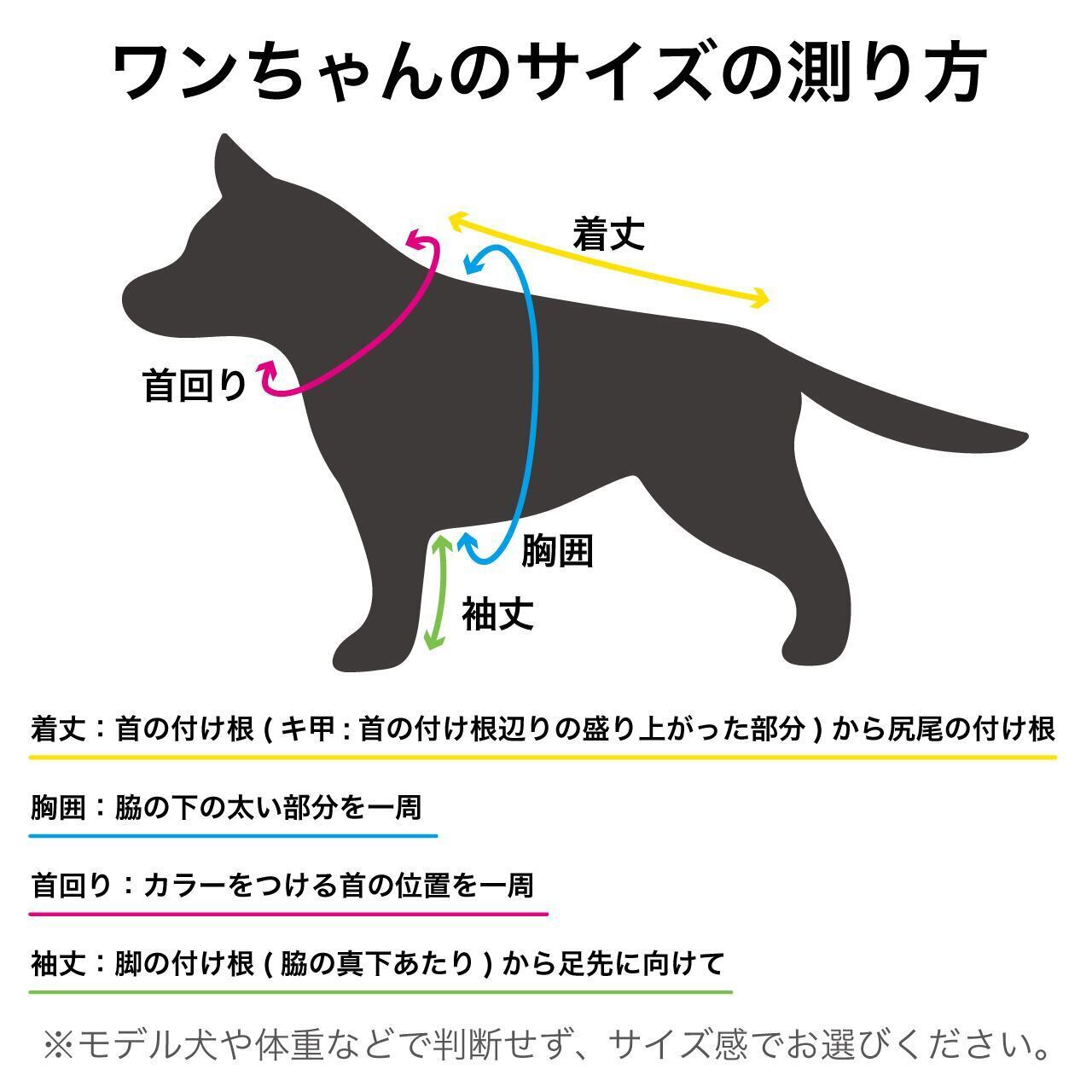 お洋服の着丈がワンちゃんの着丈より長すぎる、またはぴったり過ぎると歩行中尻尾にかかってしまったり排泄物がお洋服にかかってしまう場合がございますのでご注意ください。特に断尾をしている子・ボブテイルの子はご注意ください。