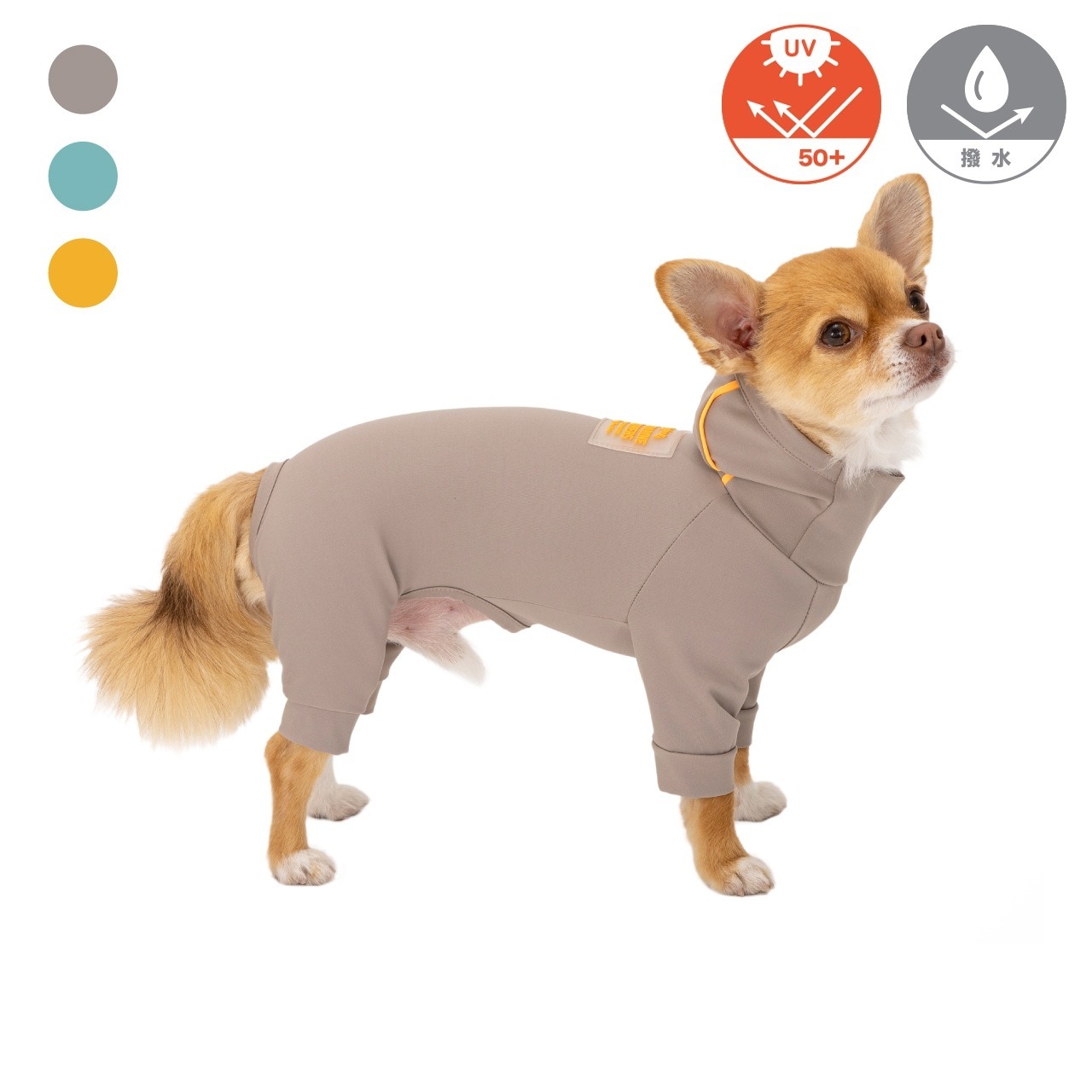 大人気アイテム「スキンタイトシリーズ」から待望の汚れや毛が付きにくい撥水タイプが登場!フードのパイピングカラーとクリアラバーワッペンの配色バランスがポイントのアクティブなワンちゃんにおすすめウェアです。